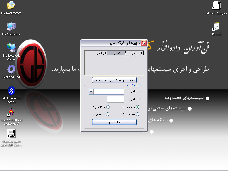 برای تعریف یک شهر جدید لازم است نام آن را در برابر نام شهر تایپ نمایید و کد آن را که شامل چهار رقم کد استان (به عنوان نمونه در استان مرکزی ۱۲۱۲) و دو رقم کد ناحیه است وارد نمایید. اما اگر شهری را قبلا تعریف نموده اید کافی است نام آن را از لیست انتخاب نمایید تا کد آن نیز که قبلا وارد شده به طور خودکار نمایش داده شود. سپس یکی از چهار فرکانس ممکن را انتخاب نموده دکمه اضافه شود را بزنید. برای حذف یک شهر /فرکانس نیز کافیست آن را از لیست بالای جعبه انتخاب نمایید و دکمه حذف شهر/فرکانس انتخاب شده را بزنید. این جعبه بعدا نیز از طریق منوی نرم افزار در اختیار شما قرار دارد و می توانید شهر/فرکانس ها را اضافه و یا کم کنید: