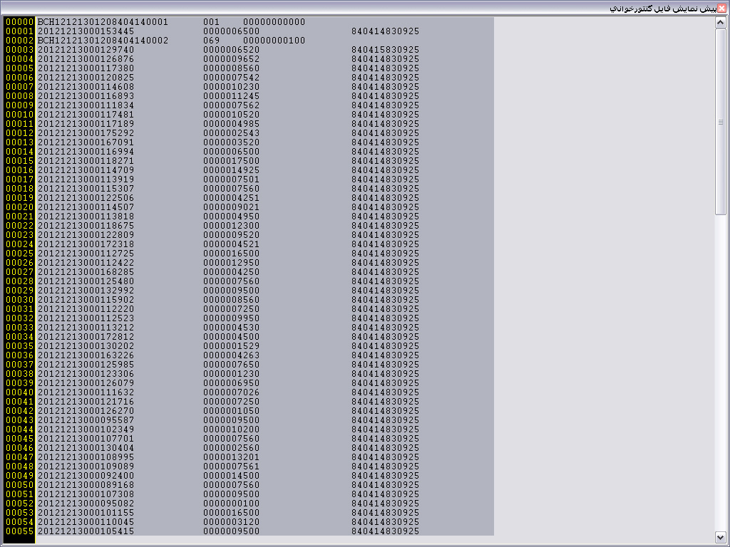 شماره خطهای فایل کنتورخوانی به صورت زرد بر زمینه مشکی در سمت چپ هر خط درج می شود: